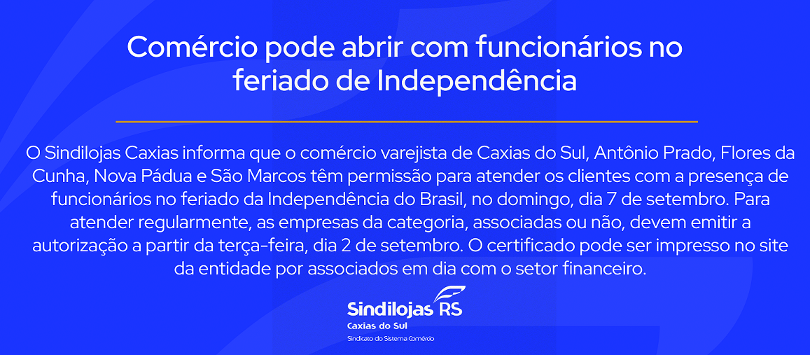 O Sindilojas Caxias informa que o comércio varejista de Caxias do Sul, Antônio Prado, Flores da Cunha, Nova Pádua e São Marcos têm permissão para atender os clientes com a presença de funcionários no feriado da Independência do Brasil, no domingo, dia 7 de setembro. Para atender regularmente, as empresas da categoria, associadas ou não, devem emitir a autorização a partir da terça-feira, dia 2 de setembro. O certificado pode ser impresso no site da entidade por associados em dia com o setor financeiro.