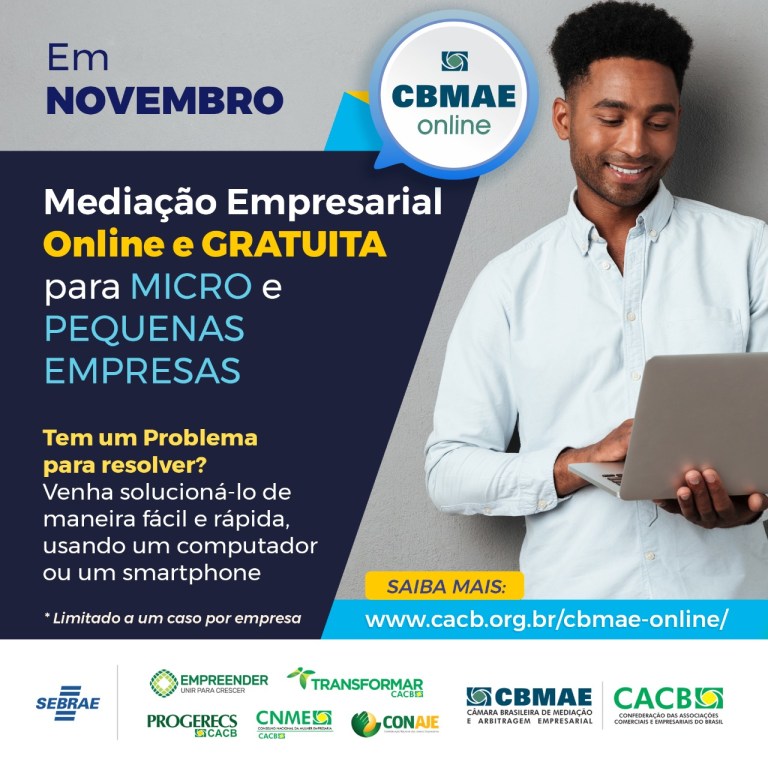 Durante todo o mês de novembro, a Confederação das Associações Comerciais e Empresariais do Brasil (CACB), por intermédio da Câmara Brasileira de Mediação e Arbitragem Empresarial (CBMAE) e com o apoio do Sebrae, realiza uma ação de atendimento de mediação online e gratuita para micro e pequenas empresas.