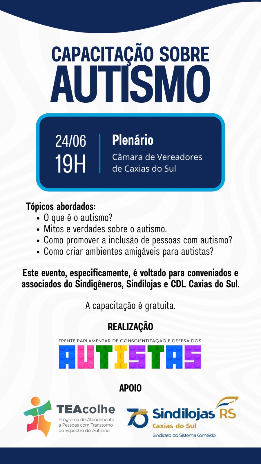 No dia 27 de junho, às 19h, no Plenário da Câmara de Vereadores de Caxias do Sul, vai ocorrer uma capacitação sobre autismo. Destinado aos conveniados e associados do Sindigêneros, Sindilojas e CDL Caxias do Sul, o evento é uma iniciativa da Frente Parlamentar de Conscientização e Defesa dos Autistas, com o apoio do Programa de Atendimento a Pessoas com Transtorno do Espectro do Autismo (TEAcolhe).