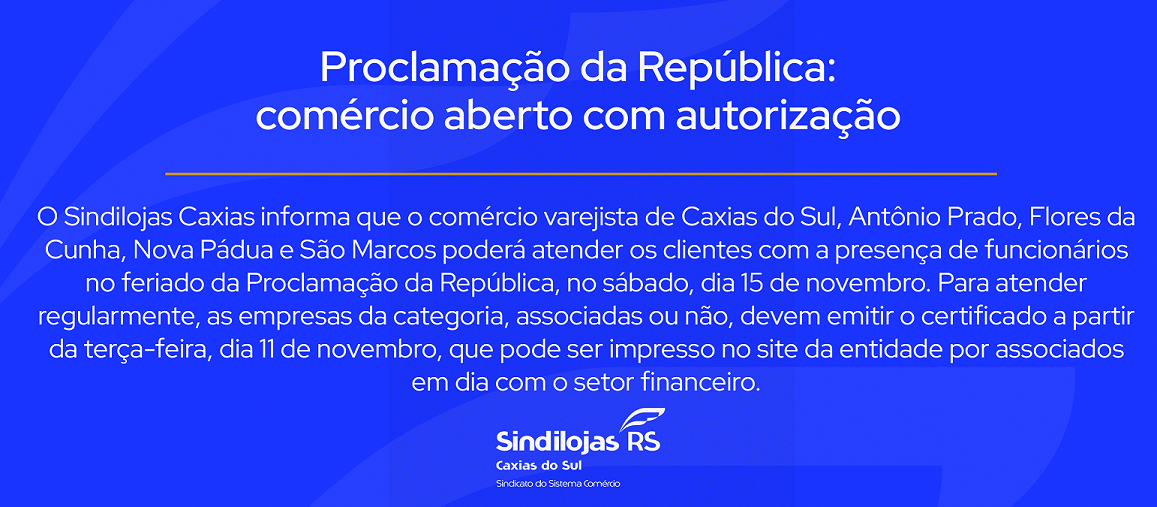 O Sindilojas Caxias informa que o comércio varejista de Caxias do Sul, Antônio Prado, Flores da Cunha, Nova Pádua e São Marcos poderá atender os clientes com a presença de funcionários no feriado da Proclamação da República, no sábado, dia 15 de novembro. Para atender regularmente, as empresas da categoria, associadas ou não, devem emitir o certificado a partir da terça-feira, dia 11 de novembro, que pode ser impresso no site da entidade por associados em dia com o setor financeiro.