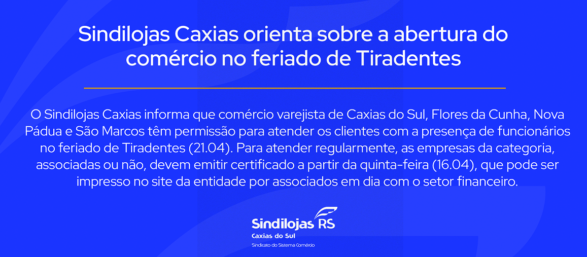 O Sindilojas Caxias informa que comércio varejista de Caxias do Sul, Flores da Cunha, Nova Pádua e São Marcos têm permissão para atender os clientes com a presença de funcionários no feriado de Tiradentes (21.04). Para atender regularmente, as empresas da categoria, associadas ou não, devem emitir certificado a partir da quinta-feira (16.04), que pode ser impresso no site da entidade por associados em dia com o setor financeiro. O não cumprimento das exigências pode acarretar em multas de R$ 1 mil a R$ 20 mil, conforme a gravidade da infração.