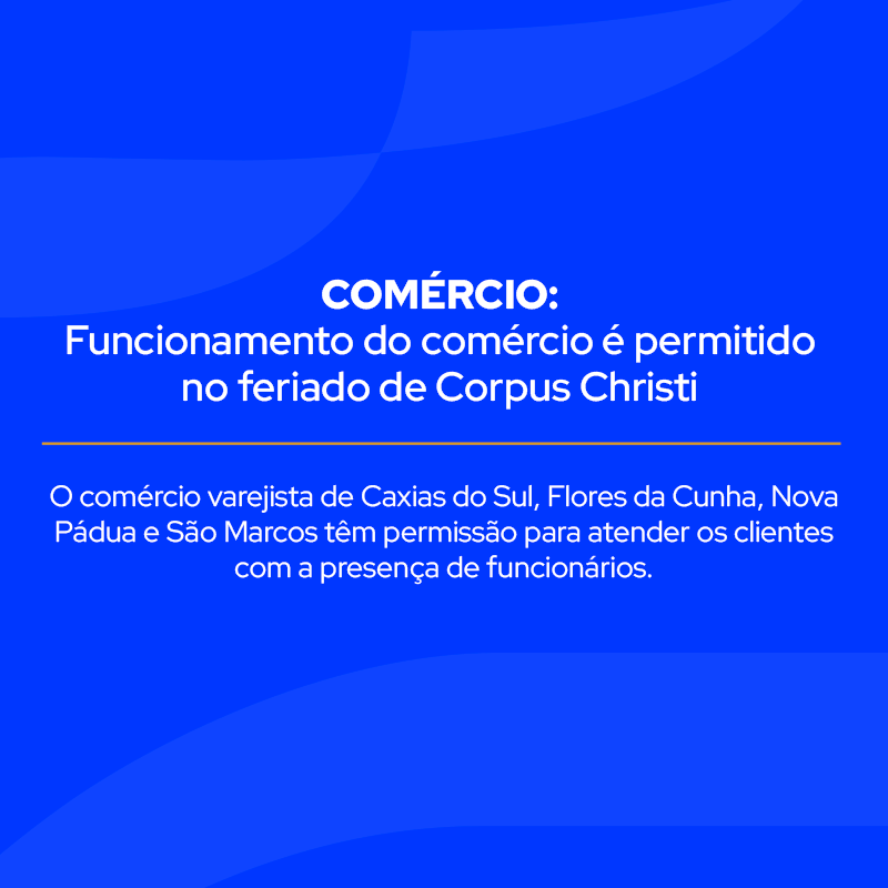 O comércio varejista de Caxias do Sul, Flores da Cunha, Nova Pádua e São Marcos têm permissão para atender os clientes com a presença de funcionários no feriado de Corpus Christi (30.05), quinta-feira. Para atender regularmente, as empresas da categoria, associadas ou não, devem emitir a autorização a partir da segunda-feira (27.05).