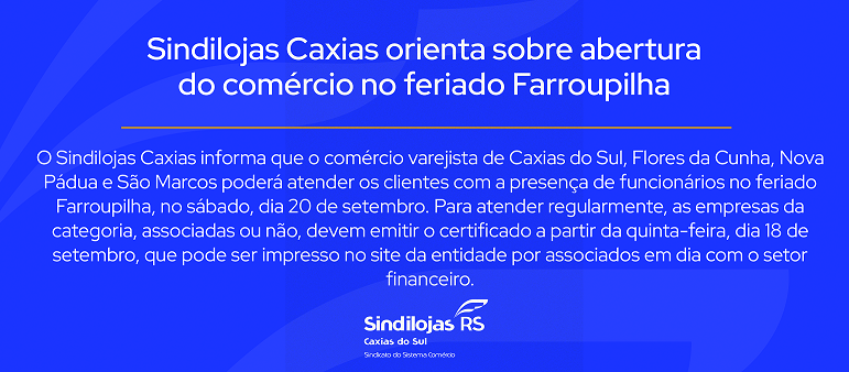 O Sindilojas Caxias informa que o comércio varejista de Caxias do Sul, Flores da Cunha, Nova Pádua e São Marcos poderá atender os clientes com a presença de funcionários no feriado Farroupilha, no sábado, dia 20 de setembro. Para atender regularmente, as empresas da categoria, associadas ou não, devem emitir o certificado a partir da quinta-feira, dia 18 de setembro, que pode ser impresso no site da entidade por associados em dia com o setor financeiro.