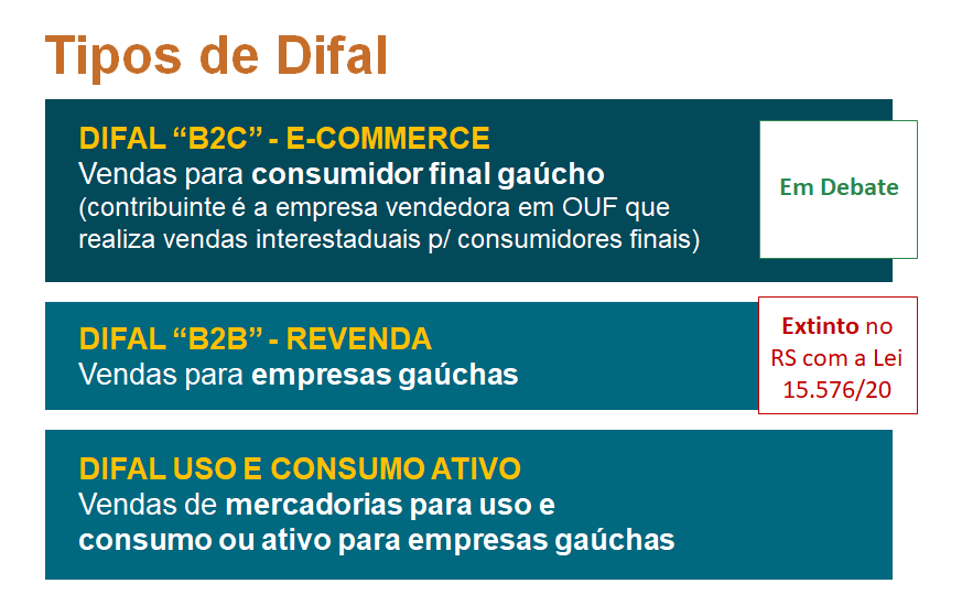 Difal refere-se ao valor do imposto devido nas operações interestaduais com destino ao Rio Grande do Sul referente à diferença entre a alíquota interestadual e a alíquota interna, que é devido pelo vendedor (de outro Estado) ou pelo comprador do RS. A administração tributária trabalha com três tipos de Difal: a “Difal B2C E-Commerce”, que está em debate, a “Difal B2B Revenda”, que foi extinta no Rio Grande do Sul com a Lei nº 15.576/20, e a “Difal de Uso e Consumo Ativo”.