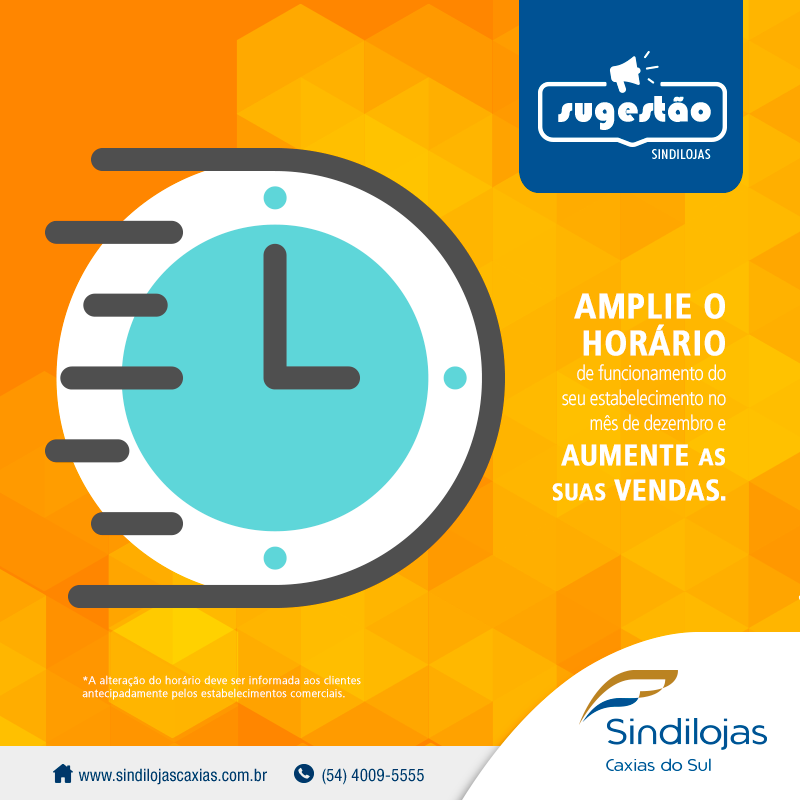 Para atender melhor ao público na época em que o movimento nas lojas é mais intenso, o Sindilojas Caxias recomenda que o horário de funcionamento durante o mês de dezembro seja ampliado.