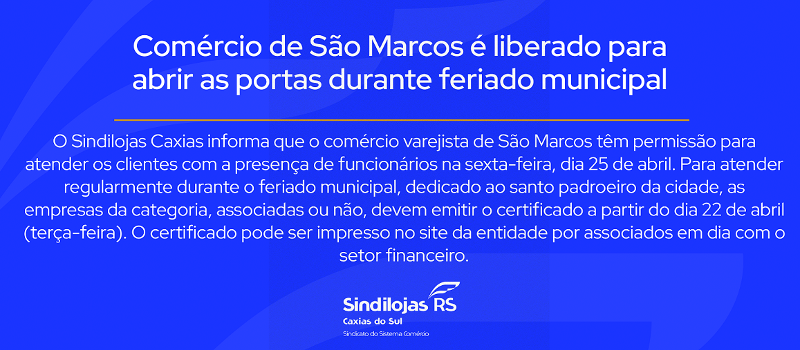 O Sindilojas Caxias informa que o comércio varejista de São Marcos têm permissão para atender os clientes com a presença de funcionários na sexta-feira, dia 25 de abril. Para atender regularmente durante o feriado municipal, dedicado ao santo padroeiro da cidade, as empresas da categoria, associadas ou não, devem emitir o certificado a partir do dia 22 de abril (terça-feira). O certificado pode ser impresso no site da entidade por associados em dia com o setor financeiro.