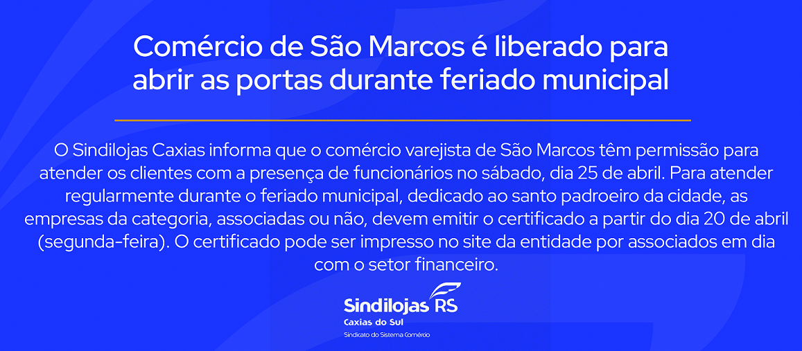 O Sindilojas Caxias informa que o comércio varejista de São Marcos têm permissão para atender os clientes com a presença de funcionários no sábado, dia 25 de abril. Para atender regularmente durante o feriado municipal, dedicado ao santo padroeiro da cidade, as empresas da categoria, associadas ou não, devem emitir o certificado a partir do dia 20 de abril (segunda-feira). O certificado pode ser impresso no site da entidade por associados em dia com o setor financeiro.