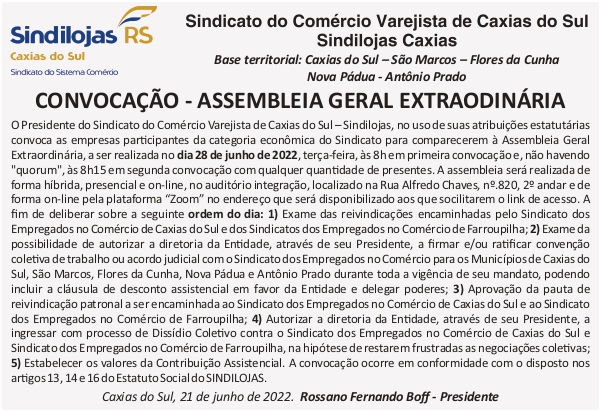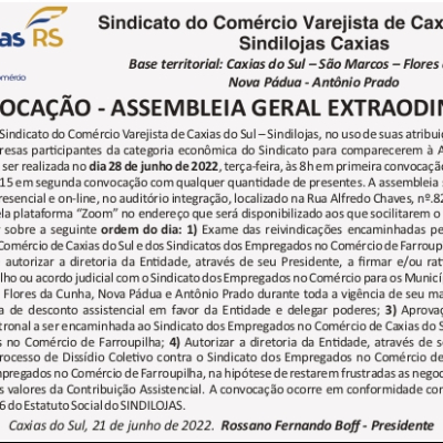 O Presidente do Sindicato do Comércio Varejista de Caxias do Sul – Sindilojas, no uso de suas atribuições estatutárias convoca as empresas participantes da categoria econômica do Sindicato para comparecerem à Assembleia Geral Extraordinária, a ser realizada no dia 28 de junho de 2022, terça-feira, às 8h em primeira convocação e, não havendo "quorum", às 8h15 em segunda convocação com qualquer quantidade de presentes. A assembleia será realizada de forma híbrida, presencial e on-line, no auditório integração, localizado na Rua Alfredo Chaves, nº.820, 2º andar e de forma on-line pela plataforma “Zoom” no endereço que será disponibilizado aos que solicitarem o link de acesso. A fim de deliberar sobre a seguinte ordem do dia: 1) Exame das reivindicações encaminhadas pelo Sindicato dos Empregados no Comércio de Caxias do Sul e dos Sindicatos dos Empregados no Comércio de Farroupilha; 2) Exame da possibilidade de autorizar a diretoria da Entidade, através de seu Presidente, a firmar e/ou ratificar convenção coletiva de trabalho ou acordo judicial com o Sindicato dos Empregados no Comércio para os Municípios de Caxias do Sul, São Marcos, Flores da Cunha, Nova Pádua e Antônio Prado durante toda a vigência de seu mandato, podendo incluir a cláusula de desconto assistencial em favor da Entidade e delegar poderes; 3) Aprovação da pauta de reivindicação patronal a ser encaminhada ao Sindicato dos Empregados no Comércio de Caxias do Sul e ao Sindicato dos Empregados no Comércio de Farroupilha; 4) Autorizar a diretoria da Entidade, através de seu Presidente, a ingressar com processo de Dissídio Coletivo contra o Sindicato dos Empregados no Comércio de Caxias do Sul e Sindicato dos Empregados no Comércio de Farroupilha, na hipótese de restarem frustradas as negociações coletivas; 5) Estabelecer os valores da Contribuição Assistencial. A convocação ocorre em conformidade com o disposto nos artigos 13, 14 e 16 do Estatuto Social do SINDILOJAS.