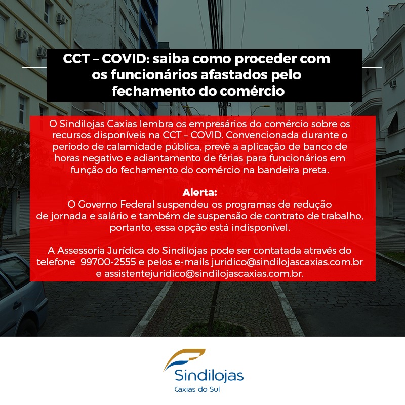 O Sindilojas Caxias lembra os empresários do comércio sobre os recursos disponíveis na CCT – COVID. Convencionada durante o período de calamidade pública, prevê a aplicação de banco de horas negativo e adiantamento de férias para funcionários em função do fechamento do comércio na bandeira preta.