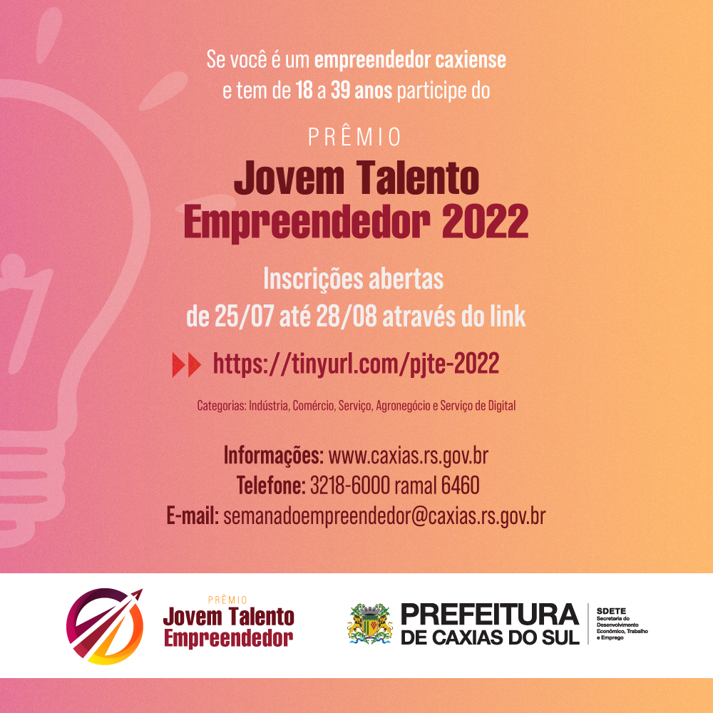 Estão abertas até o dia 28 de agosto as inscrições para o Prêmio Jovem Talento Empreendedor 2022 (PJTE 2022). A iniciativa reconhece o trabalho de jovens empresários caxienses. Para participar é necessário ter de 18 a 39 anos e ser sócio ou proprietário de uma empresa com sede no município, que tenha, no mínimo, um ano de atividades. Nesta edição, serão cinco categorias premiadas: indústria, comércio, serviços, agronegócio e serviços digitais.