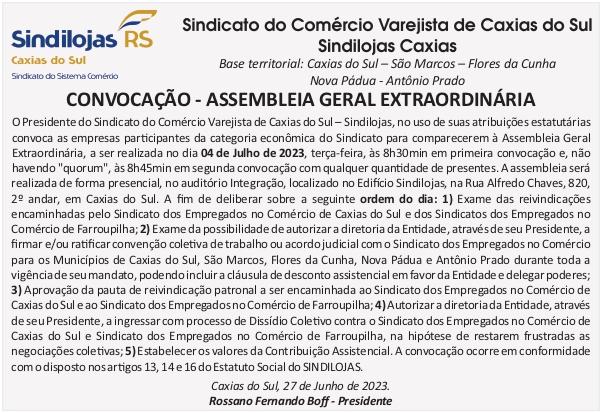 O Presidente do Sindicato do Comércio Varejista de Caxias do Sul – Sindilojas, no uso de suas atribuições estatutárias convoca as empresas participantes da categoria econômica do Sindicato para comparecerem à Assembleia Geral Extraordinária, a ser realizada no dia 04 de Julho de 2023, terça-feira, às 8h30min em primeira convocação e, não havendo "quorum", às 8h45min em segunda convocação com qualquer quantidade de presentes. A assembleia será realizada de forma presencial, no auditório Integração, localizado no Edifício Sindilojas, na Rua Alfredo Chaves, 820, 2º andar, em Caxias do Sul. A fim de deliberar sobre a seguinte ordem do dia: 1) Exame das reivindicações encaminhadas pelo Sindicato dos Empregados no Comércio de Caxias do Sul e dos Sindicatos dos Empregados no Comércio de Farroupilha; 2) Exame da possibilidade de autorizar a diretoria da Entidade, através de seu Presidente, a firmar e/ou ratificar convenção coletiva de trabalho ou acordo judicial com o Sindicato dos Empregados no Comércio para os Municípios de Caxias do Sul, São Marcos, Flores da Cunha, Nova Pádua e Antônio Prado durante toda a vigência de seu mandato, podendo incluir a cláusula de desconto assistencial em favor da Entidade e delegar poderes; 3) Aprovação da pauta de reivindicação patronal a ser encaminhada ao Sindicato dos Empregados no Comércio de Caxias do Sul e ao Sindicato dos Empregados no Comércio de Farroupilha; 4) Autorizar a diretoria da Entidade, através de seu Presidente, a ingressar com processo de Dissídio Coletivo contra o Sindicato dos Empregados no Comércio de Caxias do Sul e Sindicato dos Empregados no Comércio de Farroupilha, na hipótese de restarem frustradas as negociações coletivas; 5) Estabelecer os valores da Contribuição Assistencial. A convocação ocorre em conformidade com o disposto nos artigos 13, 14 e 16 do Estatuto Social do SINDILOJAS.