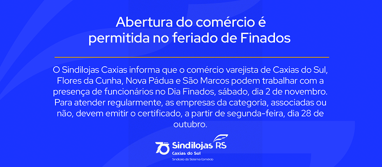 O Sindilojas Caxias informa que o comércio varejista de Caxias do Sul, Flores da Cunha, Nova Pádua e São Marcos podem trabalhar com a presença de funcionários no Dia Finados, sábado, dia 2 de novembro. Para atender regularmente, as empresas da categoria, associadas ou não, devem emitir o certificado, a partir de segunda-feira, dia 28 de outubro.