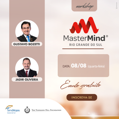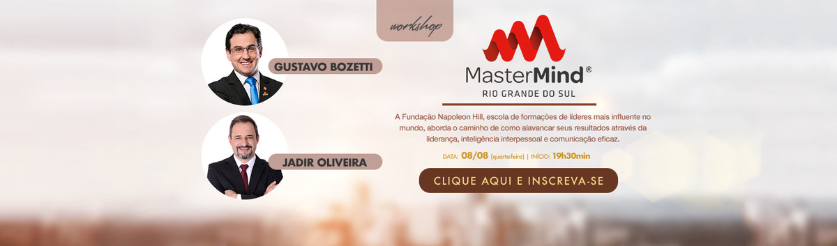 O Workshop "Liderando para resultados” vai ser apresentado pelos palestrantes Gustavo Bozetti e Jadir Oliveira. Gustavo Bozetti é diretor da Fundação Napoleon Hill e dos Treinamentos MasterMind para o Estado do Rio Grande do Sul. Formado em Marketing, também é coach pessoal e profissional, com especialização em Liderança Comportamental com mais de 10 anos de experiência como Instrutor Comportamental formado pelo Instituto de Albuquerque nas áreas de Comunicação, Vendas, Inteligência Interpessoal, Gerenciamento e Liderança. Jadir Oliveira é empresário, com formações em gestão, gerenciamento de equipe de vendas, terapeuta comportamental, instrutor MasterMindFormado e Licenciado pela The Napoleon Hill Foundation EUA.